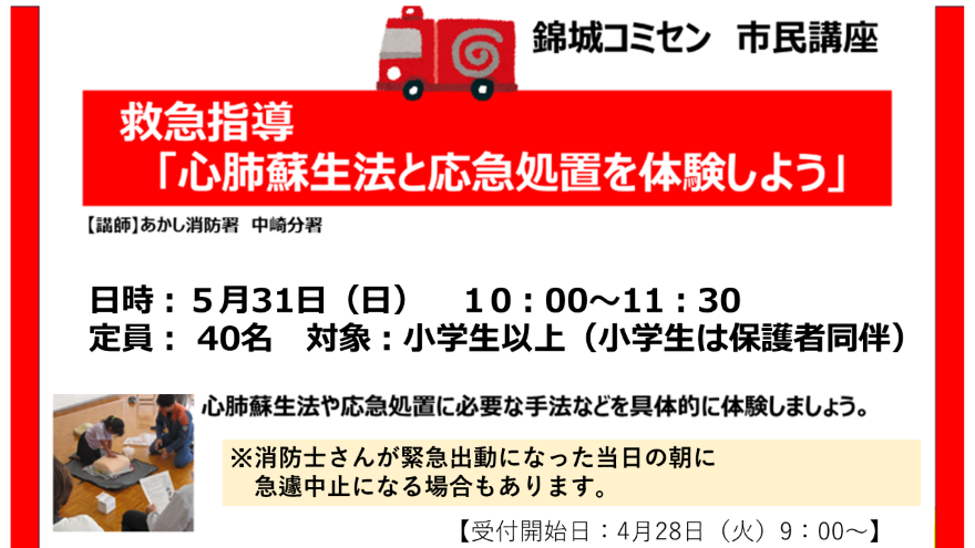 救急指導「心肺蘇生法と応急処置を体験しよう」…