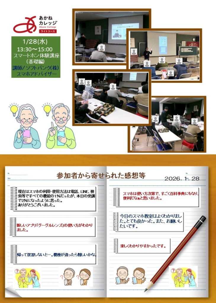 あかねカレッジライトコース講座「スマートホン体験講座(基礎編)」を開催しました 投稿日 2026年1月31日 著者 uozumihigashicom カテゴリー 未分類 1月28日(水)の午後から、ソフトバンク(株)スマホアドバイザーを講師にお迎えして、見出しの講座を開催しました。受講された皆さまから寄せられました感想及び講座の様子等は、別紙でご確認ください。 この記事を書いた人 uozumihigashicom 記事一覧