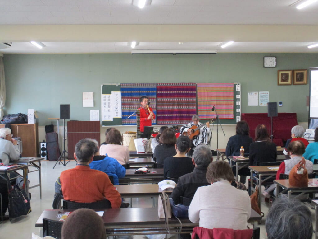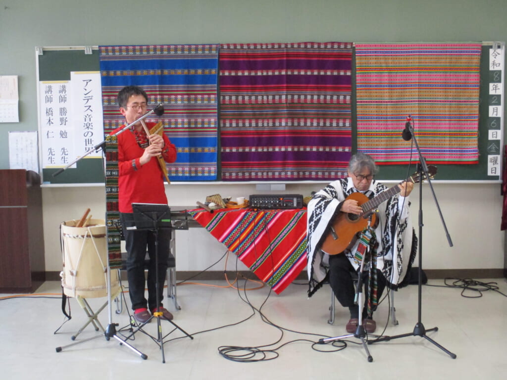 2月6日(金)市民講座「アンデス音楽の世界」を開催しました 投稿日 2026年2月13日 著者 eigashimacom カテゴリー 未分類 今日は勝野勉先生と橋本仁先生を講師にお招きし、市民講座「アンデス音楽の世界」を開催しました。お二人ともに日本で著名なケーナ奏者とあって、素晴らしい演奏を聴かせていただきました。途中、中南米の地理や歴史の説明もしていただき、アンデス音楽についての知識や理解も深まりました。これで5年連続で講座を開催していますが、いつも受講生に大好評です!(^^)!。来年度もお願いしてありますので、ふるってご参加くださいね。 この記事を書いた人 eigashimacom 記事一覧