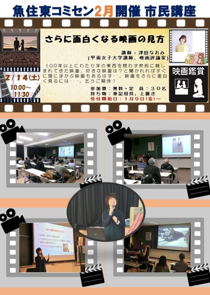 2月14日(土)の午前中、津田 なおみ さん〈甲南女子大学講師・映画評論家〉を講師にお迎えして、見出しの講座を開催しました。当日の講座の様子(写真)等は、別紙でご確認ください。