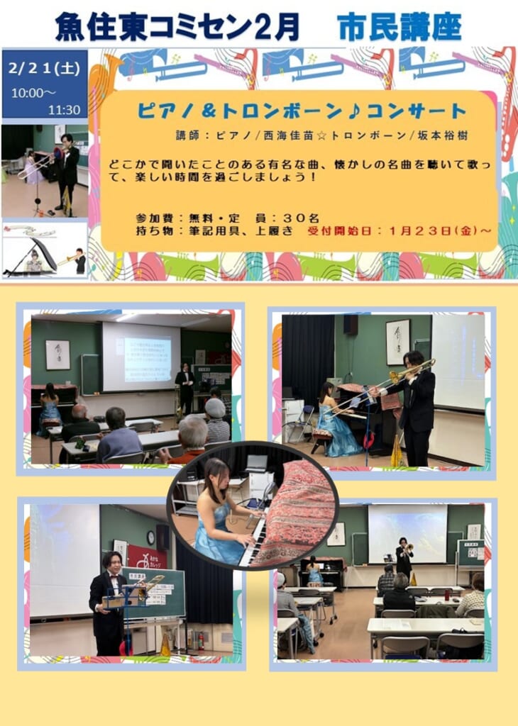 2月21日(土)の午前中、西海 佳苗 さん〈ピアノ〉、坂本 裕樹 さん〈トロンボーン〉のお二人を講師にお迎えして、見出しの講座を開催しました。当日の講座の様子(写真)等は、別紙でご確認ください。