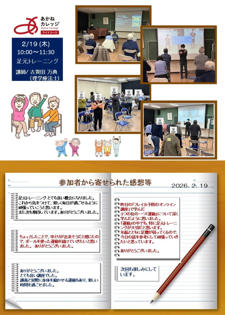 あかねカレッジライトコース講座「人生100年時代 足元トレーニング」を開催しました 投稿日 2026年2月27日 著者 uozumihigashicom カテゴリー 未分類 2月19日(木)の午前中、古賀田 万典 さん〈理学療法士〉さんを講師にお迎えして、見出しの講座を開催しました。人生100年時代と言われて久しいですが、ご自分の足で最後まで動ける身体づくりを目指して、普段の生活で無理なく続けられる運動を、最近の健康情報等と併せて体験していただきました。当日の講座の様子(写真)等は、別紙でご確認ください。 この記事を書いた人 uozumihigashicom 記事一覧
