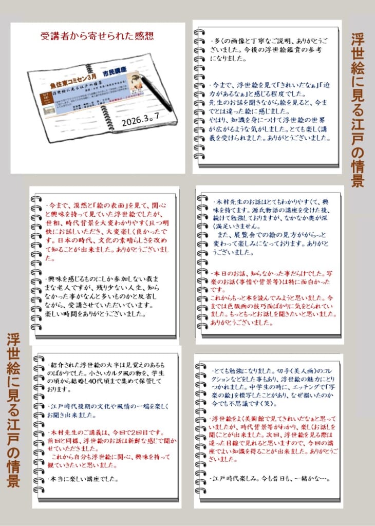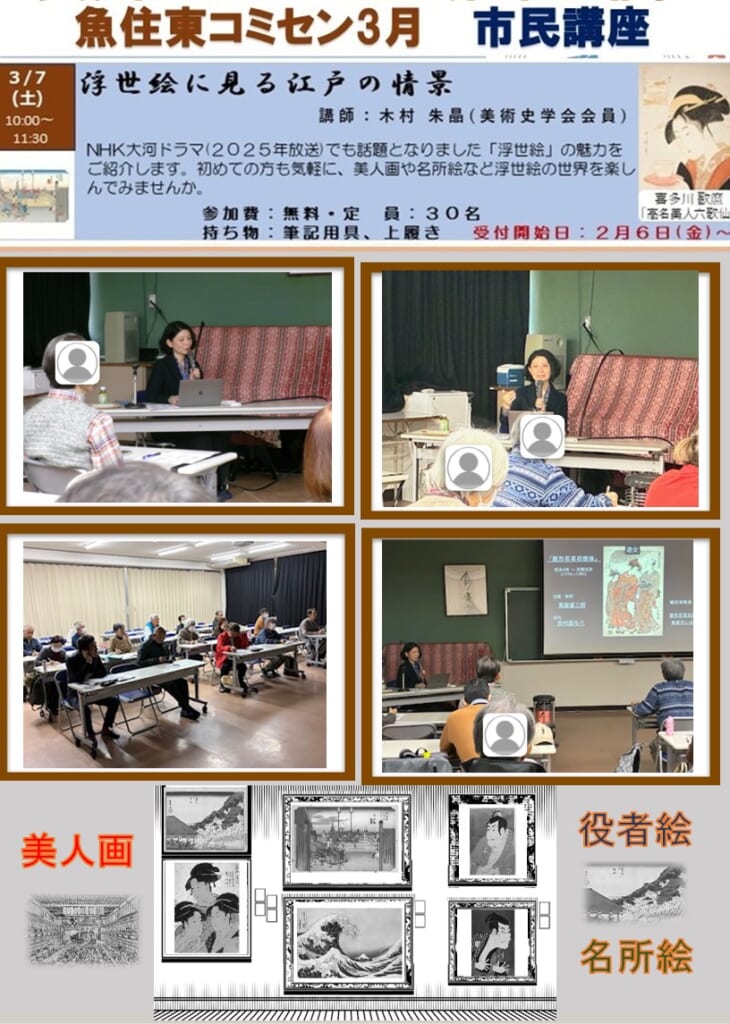 3月7日(土)の午前中、木村朱晶さん〈美術史学会会員〉を講師にお迎えして、見出しの講座を開催しました。昨年NHKの大河ドラマでも話題になりました「浮世絵」の魅力を、当時の時代背景等もまじえて詳しく解説していただきました。受講された皆さまから寄せられました感想及び講座の様子〈写真〉等は、別紙でご確認ください。