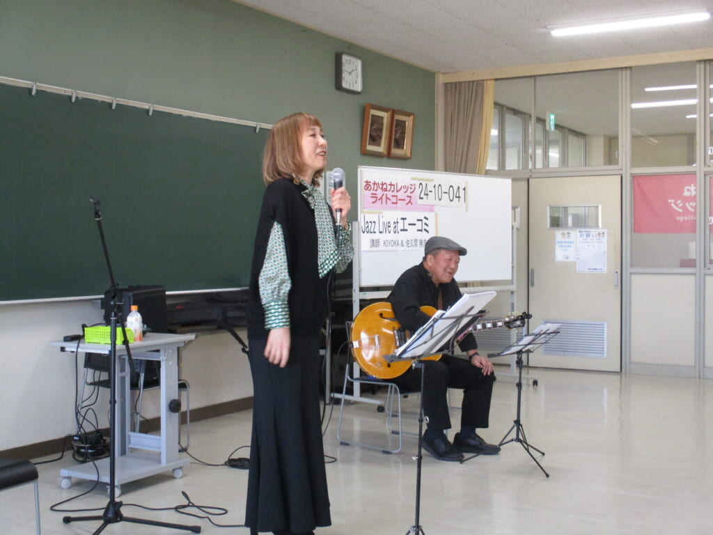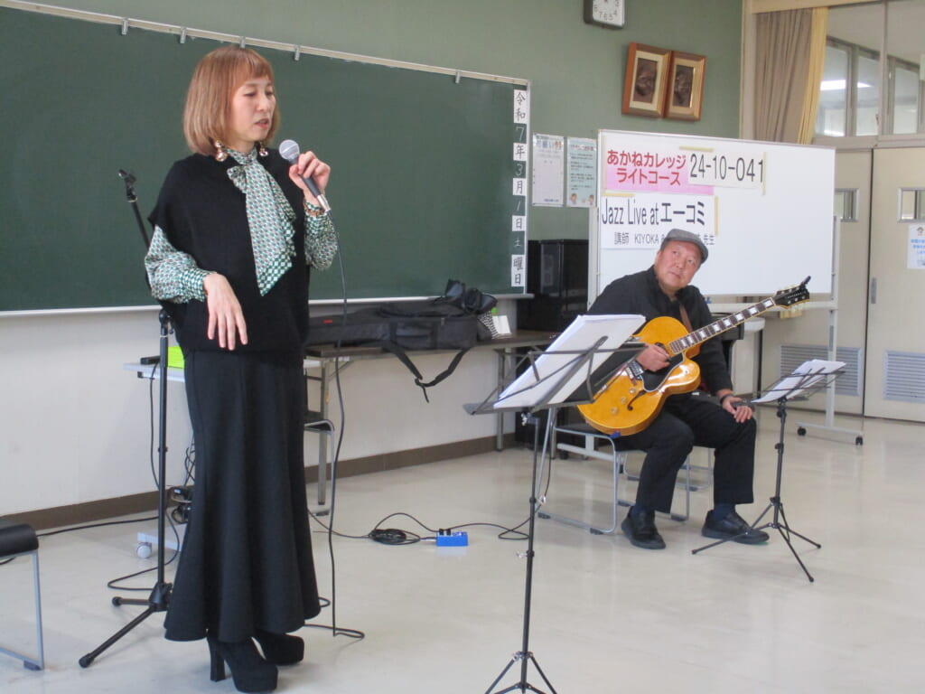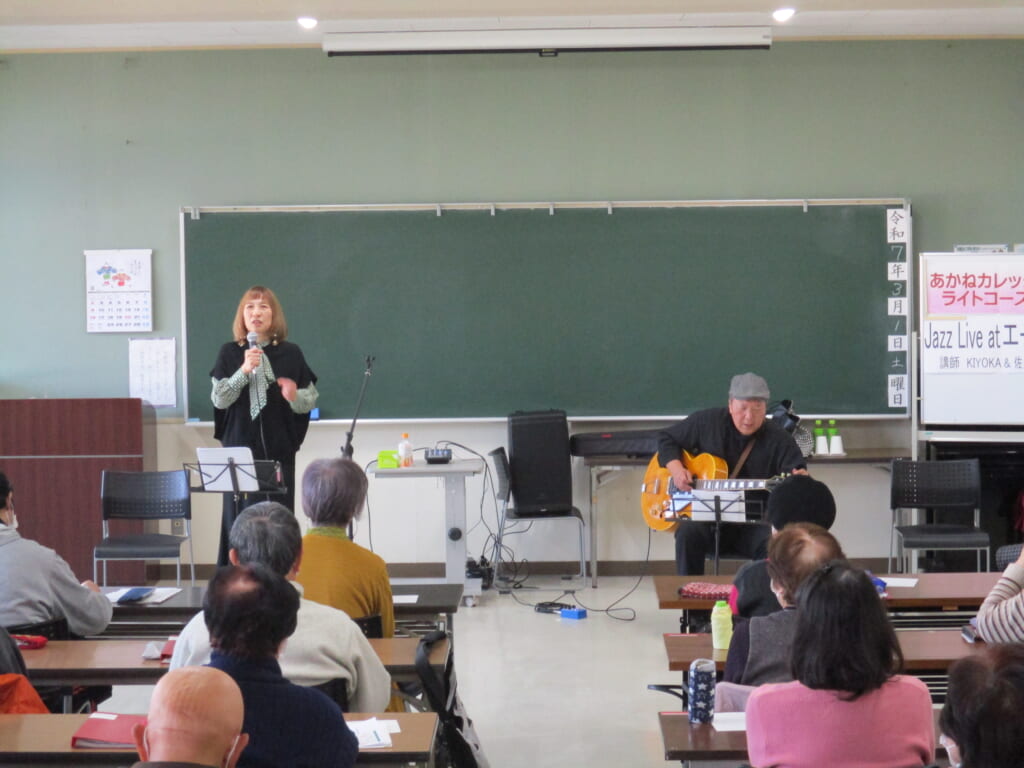 今日は、KIYOKAさんと佐久間勝浩さんを講師にお迎えし、3月1日(土)ライトコース講座「Jazz Live at エーコミ」を開催しました。KIYOKAさんには昨年の同時期にも同名の講座をお引き受けいただきましたが、今回も大好評でした。Jazz以外にも「津軽海峡冬景色」や「ラブ・イズ・オーバー」をJazz風にアレンジして演奏されるなど、受講生を飽きさせないラインアップでした。ブルージーなギターの音色にハスキーなボーカルが素晴らしくマッチして、幸せな午後のひと時を過ごすことができました。来年度もお願いしましたので、お楽しみに!(^^)!。