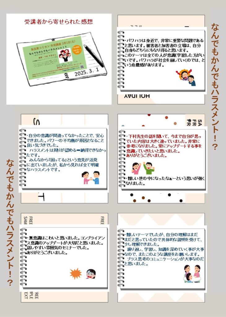 市民講座「なんでもかんでもハラスメント!?~気をつけるべき5つのこと~」を開催しました 投稿日 2025年3月4日 著者 uozumihigashicom カテゴリー 未分類 3月1日(土)の午前中、下村 千恵さん<FJK「NPO法人ファザーリング・ジャパン関西」理事>を講師にお迎えして、見出しの市民講座を開催しました。受講された皆さまから寄せられました感想及び講座の様子等は、別紙でご確認ください。 この記事を書いた人 uozumihigashicom 記事一覧