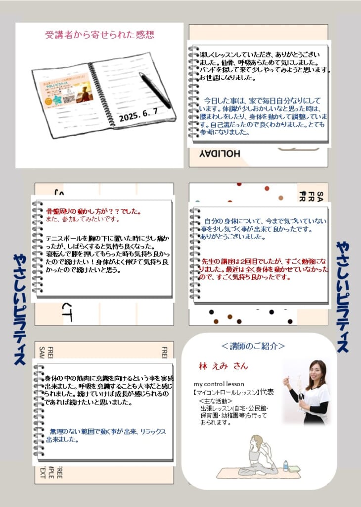 市民講座「やさしいピラティス」を開催しました 投稿日 2025年6月17日 著者 uozumihigashicom カテゴリー 未分類 6月7日(土)の午前中、林 えみさん<my control lesson マイコントロール レッスン 代表 >を講師にお迎えして、見出しの講座を開催しました。当コミセンでは、昨年5月以来2回目の開催です。受講者から寄せられました感想及び講座の様子<写真>等は別紙でご確認ください。 この記事を書いた人 uozumihigashicom 記事一覧