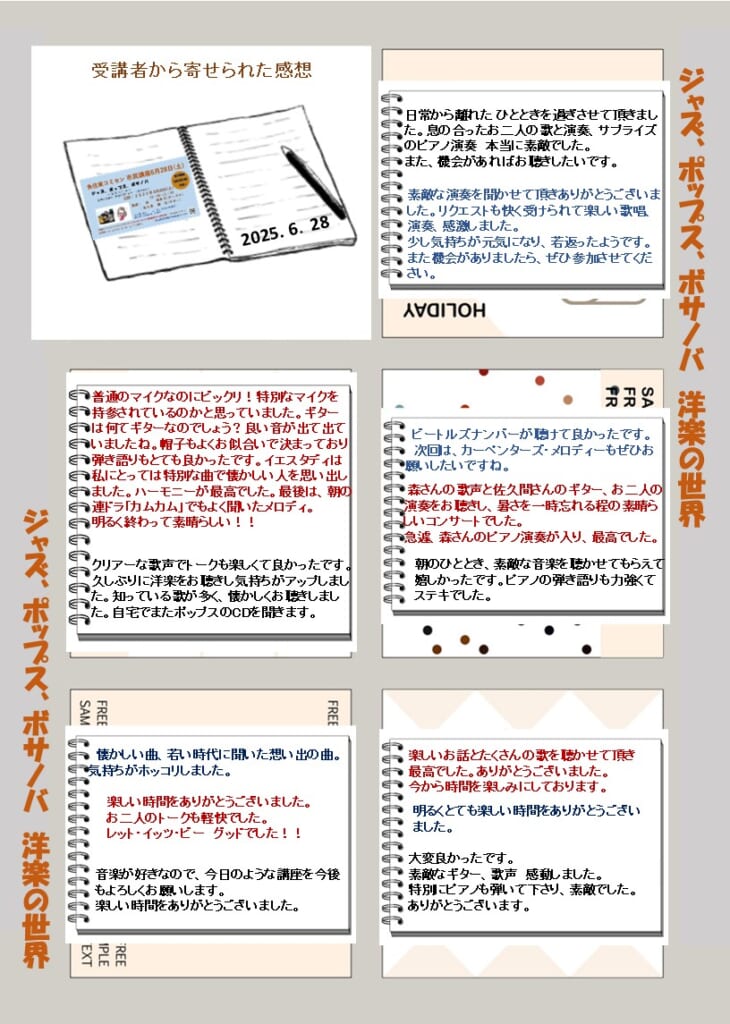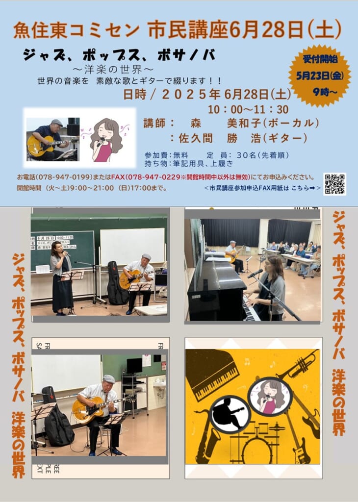 市民講座「ジャズ、ポップス、ボサノバ~洋楽の世界~」を開催しました 投稿日 2025年7月11日 著者 uozumihigashicom カテゴリー 未分類 6月28日(土)の午前中、佐久間 勝浩さん(ギター)、森 美和子さん(ピアノ・ボーカル)を講師にお迎えして、見出しの講座を開催しました。当コミセンでは3年ぶりの開催となります。受講された方から寄せられました感想及び講座の様子<写真>等は別紙でご確認ください。 この記事を書いた人 uozumihigashicom 記事一覧