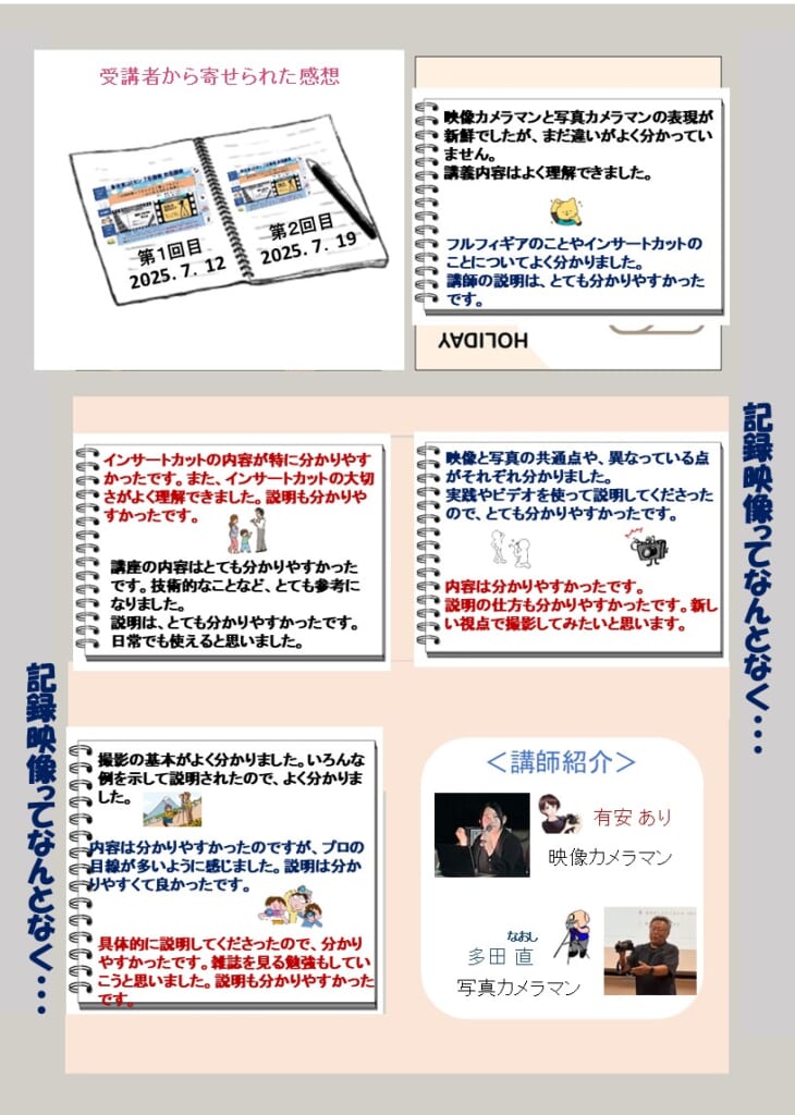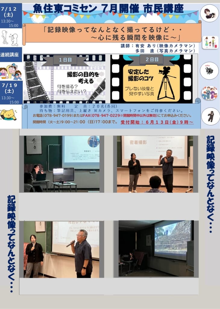 7月12日(土)&19日(土) 市民講座「記録映像ってなんとなく撮ってるけど‥~心に残る瞬間を映像に~」を開催しました 投稿日 2025年7月23日 著者 uozumihigashicom カテゴリー 未分類 7月12日(土)及び7月19日の午前中2週連続で、有安ありさん(映像カメラマン)、多田直さん(写真カメラマン)のお二人を講師にお迎えして、当コミセンでは初めての開催となります 見出しの市民講座を開催しました。今回の講座では、スマホや家庭用カメラを使って、思い出をより魅力的に記録するプロの撮影技術を学びました。受講された皆さまから寄せられました感想及び講座の様子<写真>等は、別紙でご確認ください。 この記事を書いた人 uozumihigashicom 記事一覧