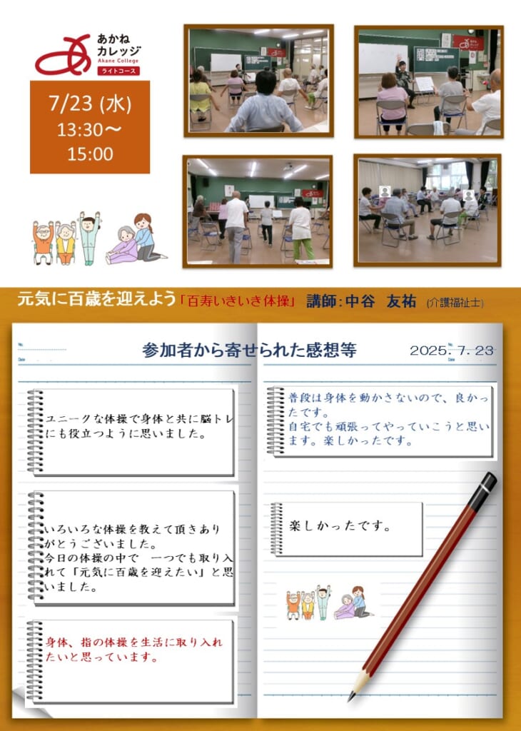 あかねカレッジライトコース講座「元気に100歳を迎えよう~百寿いきいき体操~」を開催しました 投稿日 2025年7月25日 著者 uozumihigashicom カテゴリー 未分類 7月23日(水)の午後から、中谷友祐さん<介護福祉士>を講師にお迎えして、見出しの講座を開催しました。一人でも多くのシニアを元気に!との想いでみなさんの健康な身体作りをサポートしておられる講師から「自宅でできる5分体操」を教えて頂きました。受講された皆さまから寄せられました感想及び講座の様子<写真>等は、別紙でご確認ください。 この記事を書いた人 uozumihigashicom 記事一覧