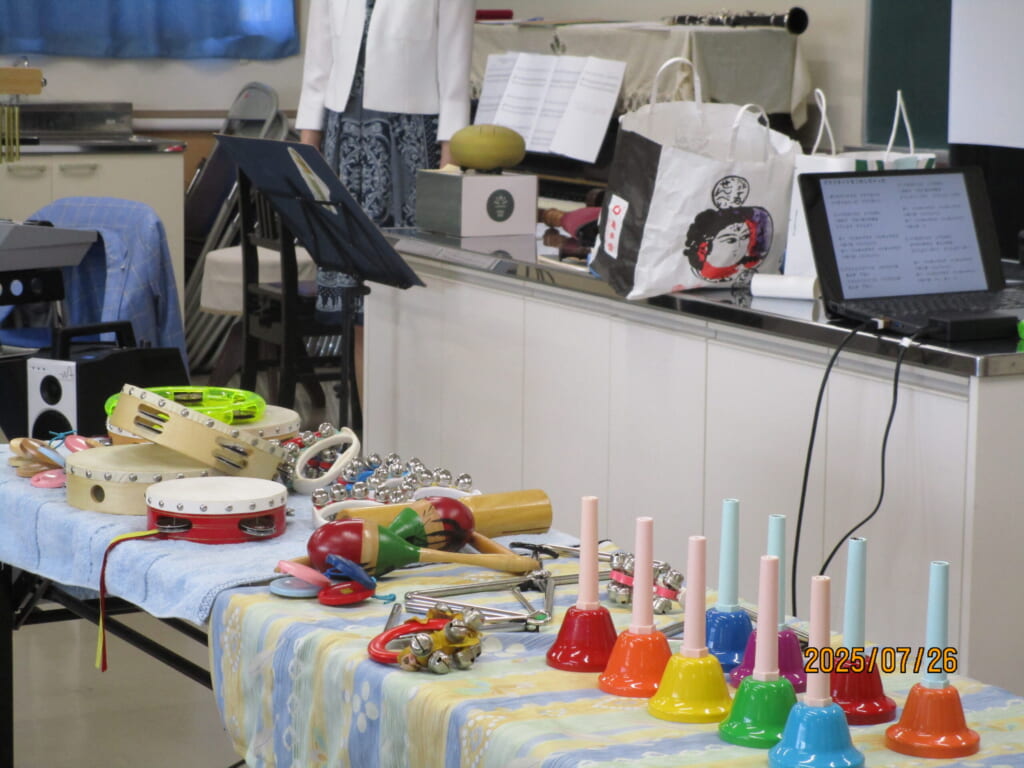 ムジカライゼのみなさんの演奏や歌唱を聞かせていただいたり、「クラリネットをこわしちゃった」や「せかいじゅうのこどもたちが」等の曲をいっしょに歌ったり、手作り楽器やトライアングル、カスタネットなどを使って一緒に演奏したりしました。また、身ぶり手ぶりをつけて歌う曲もあり、子どもたちだけでなくお母さんやお父さんもノリノリで楽しむことができたように思います。