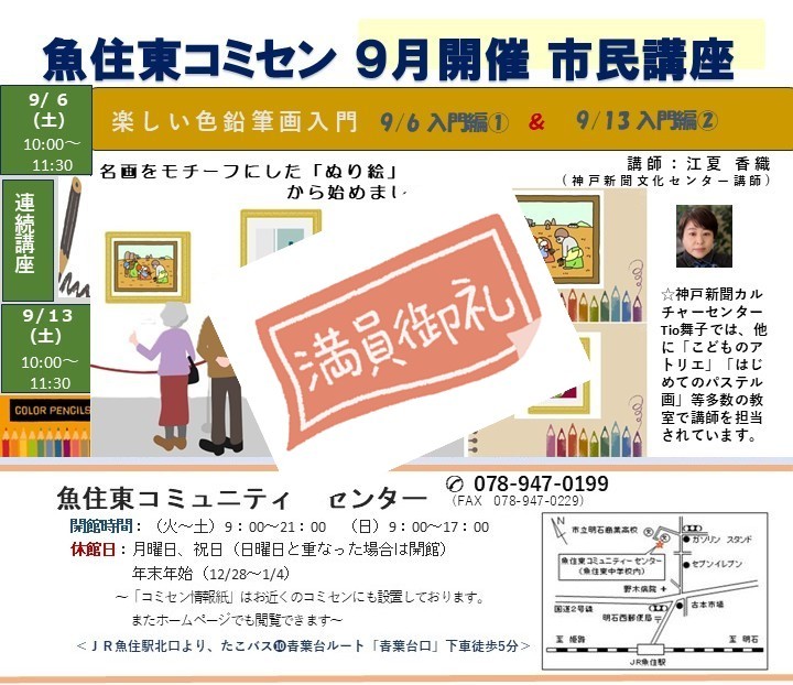 市民講座9月6日(土)&同13日(土)開催予定の連続講座「楽しい色鉛筆画入門①②」は募集定員に達しました