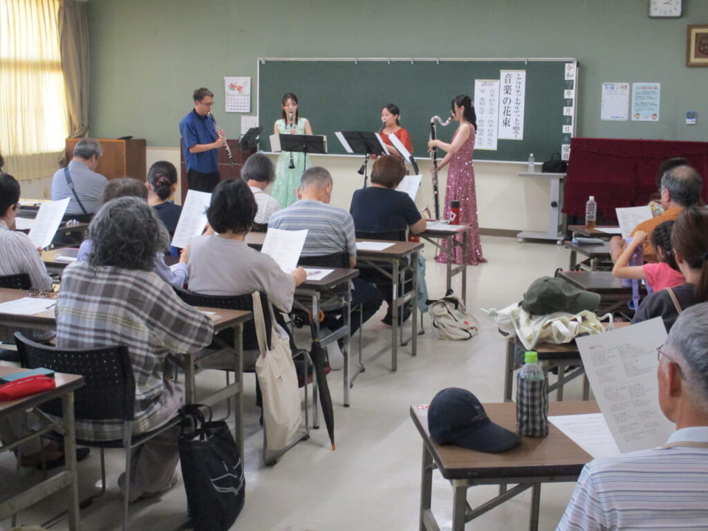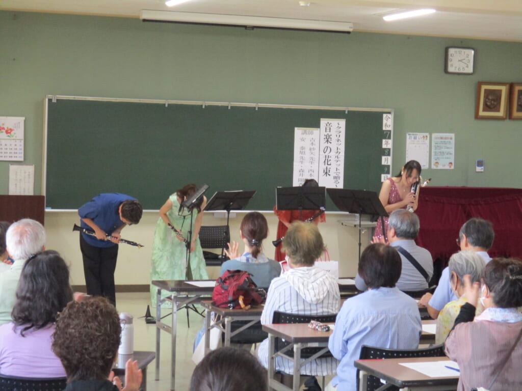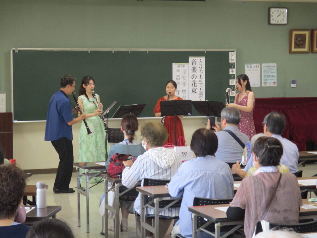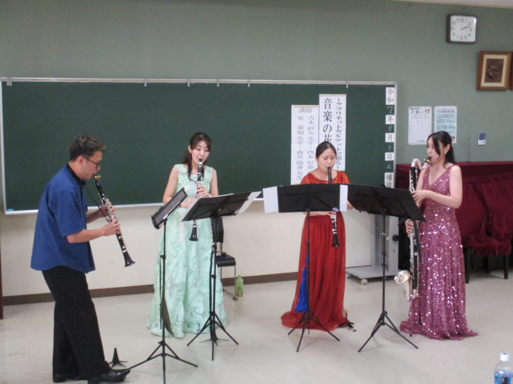 8月9日(土)市民講座「音楽の花束」を開催しました 投稿日 2025年8月9日 更新日 2025年8月10日 著者 eigashimacom カテゴリー 未分類 今日は講師にクラリネット・カルテット(吉本沙矢様・安 泰旭様・西本彩香様・森井陽香様)を講師にお招きし、市民講座「音楽の花束」を開催しました。同じ楽器でこんなに様々な音色や曲が演奏できることにビックリ!素晴らしい演奏力で受講生を魅了していただきました。本当に素晴らしい演奏でした。また是非聴きたいと思いました。頑張ってオファーしてみます!(^^)!。 この記事を書いた人 eigashimacom 記事一覧