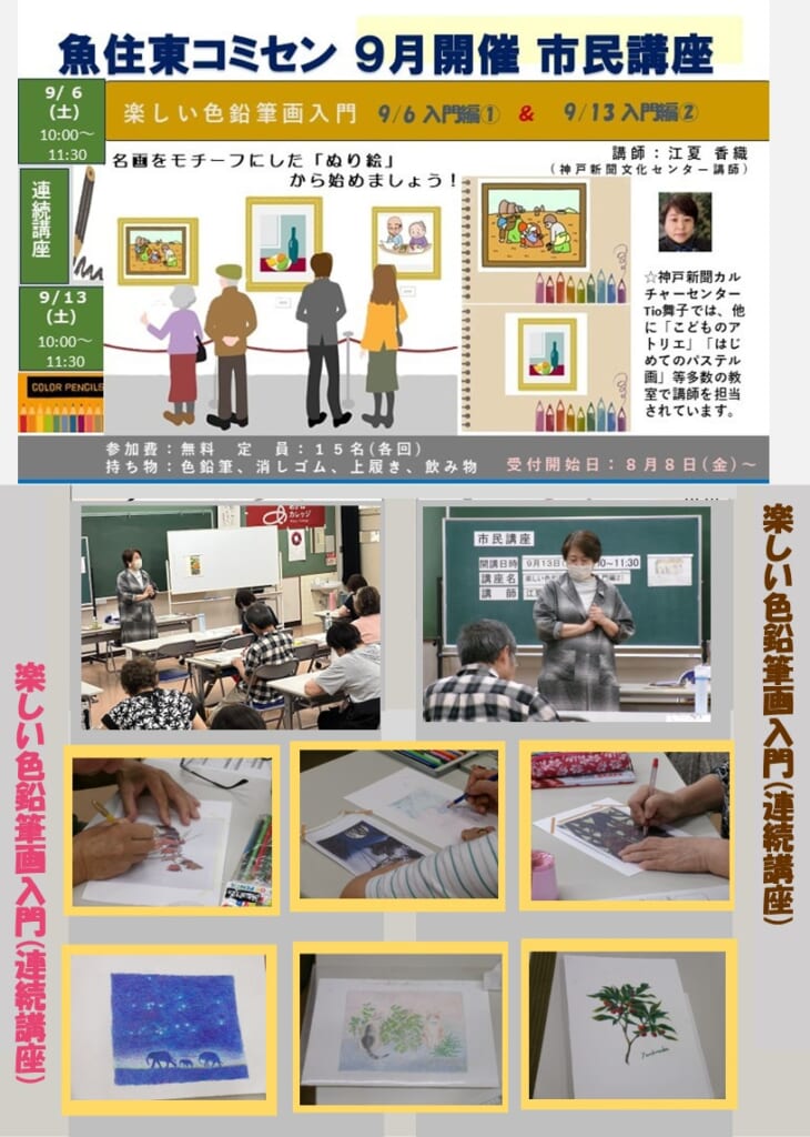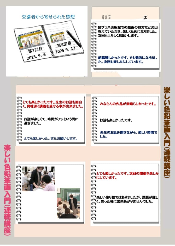 市民講座「楽しい色鉛筆画入門 連続講座①②」を開催しました 投稿日 2025年9月26日 著者 uozumihigashicom カテゴリー 未分類 9月6日(土)および9月13日(土)の午前中、江夏香織さん(神戸新聞文化センター講師)を講師にお迎えして、見出しの講座を開催しました。受講者から寄せられました感想および講座の様子<写真等>は、別紙でご確認ください。 この記事を書いた人 uozumihigashicom 記事一覧