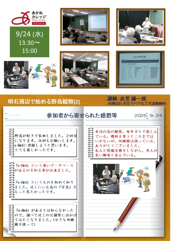 あかねカレッジライトコース講座「明石周辺で始める野鳥観察(2)」を開催しました
