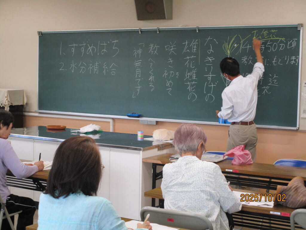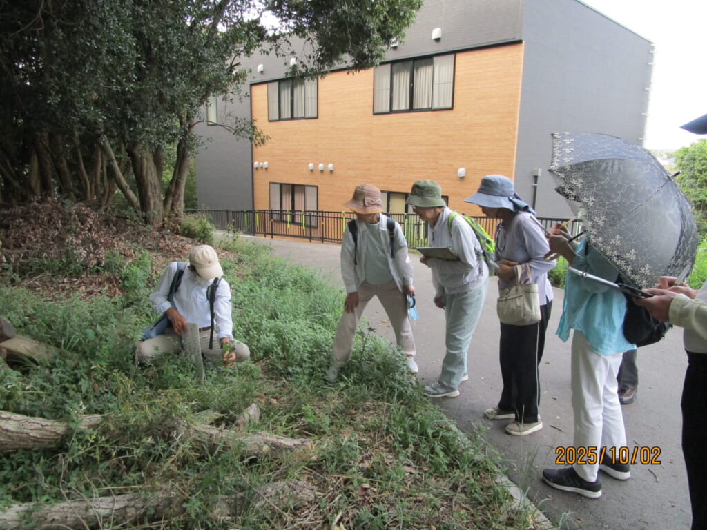 あかねカレッジの講師も務めておられる 高野 哲司先生を講師に迎え、市民講座「秋の明石公園の草花を楽しむ」を開催しました。受講された方達からは、「明石公園で、日ごろは何気なく通りすぎる所に目を向け、草花の発見はとても楽しい時間でした。」 「先生に草花の名前をおしえてもらい、もっと植物に興味をもちました。」 「ナキリスゲ、ネズミノオ、ツユクサをじっくり見ることが出来てとてもよかった」 「明石公園をゆっくり歩くことは無いので、良い機会になりました。」などの感想をいただきました。 先生から受けた草花の詳細や明石公園内の過去と現在の環境の変化、そして先生が即興で作られた短歌等を聞かせていただき、さらに草花に興味をもたれたようです。