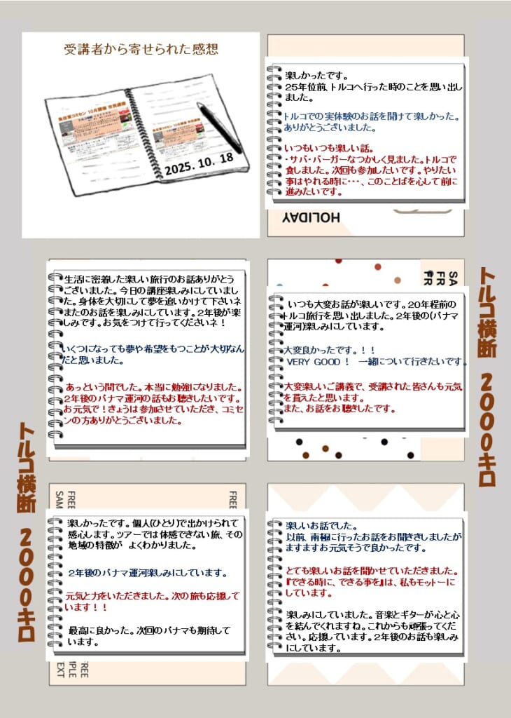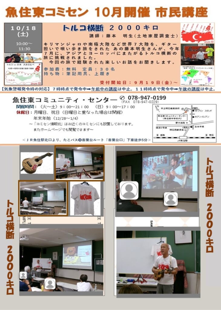 市民講座「トルコ横断2000キロ」を開催しました 投稿日 2025年10月21日 著者 uozumihigashicom カテゴリー 未分類 10月18日(土)の午前中、藤本 明生さん(土地家屋調査士)を講師にお迎えして、見出しの講座を開催しました。今年7月から8月にかけて、アジアとヨーロッパにまたがるトルコ横断の旅に挑戦された あの冒険家 藤本 明生さんのお話をたっぷりお聴きしました。受講者から寄せられました感想および講座の様子<写真等>は、別紙でご確認ください。 この記事を書いた人 uozumihigashicom 記事一覧