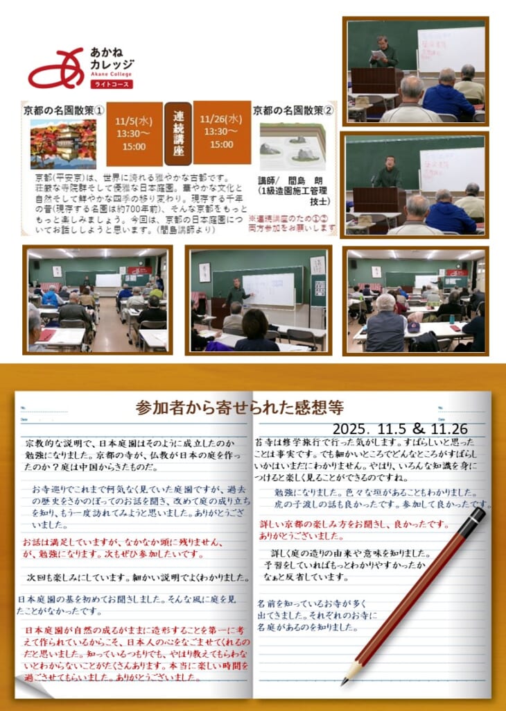 あかねカレッジライトコース講座「京都の名園散策[連続講座]①②」を開催しました 投稿日 2025年12月12日 著者 uozumihigashicom カテゴリー 未分類 11月5日(水)と11月26日(水)の午後から、間島 朗さん〈1級造園施工管理技士〉をお迎えして、見出しの講座を開催しました。受講者から寄せられました感想および講座の様子〈写真等〉は、別紙でご確認ください。 この記事を書いた人 uozumihigashicom 記事一覧