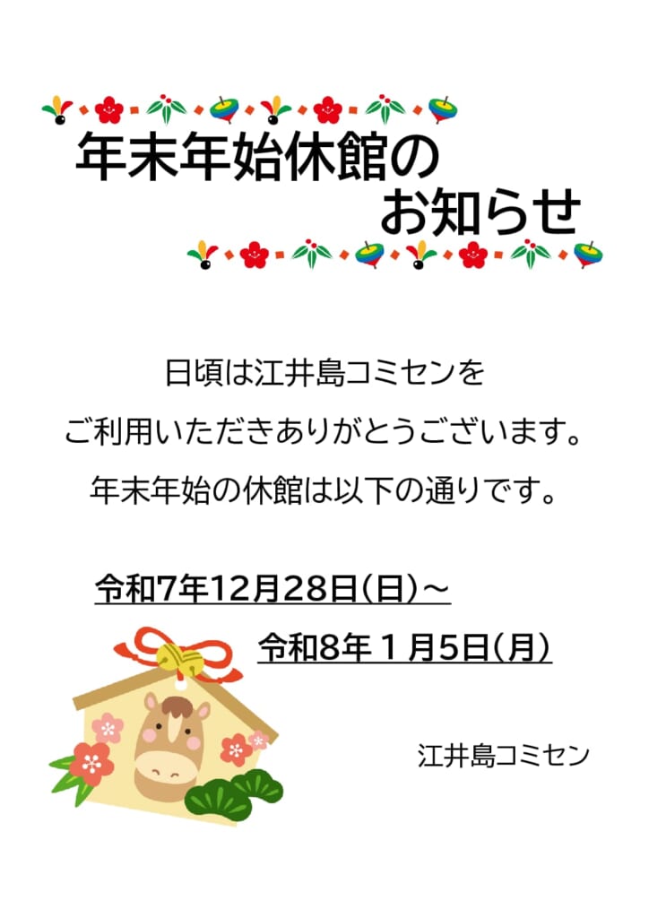 年末年始休館のお知らせ 投稿日 2025年12月20日 著者 eigashimacom カテゴリー 未分類 年末年始休館日は以下の通りです。来年もどうぞよろしくお願いいたします。 この記事を書いた人 eigashimacom 記事一覧