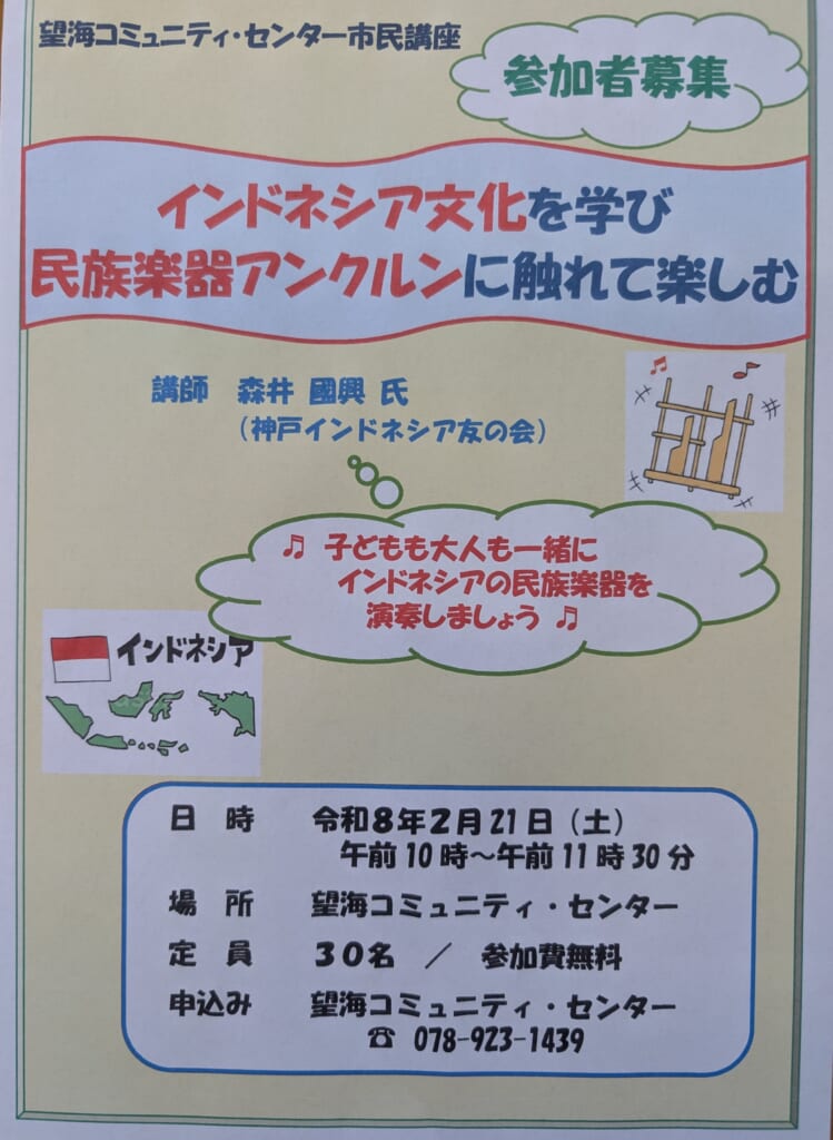 市民講座「インドネシア文化を学び 民族楽器アンクルに触れて楽しむ」(2月21日開催)参加者募集中