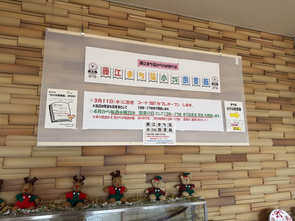 キッズスペース併設のブックスポットです。本の貸し出しを開始しました。月1度楽しい「笑くぼカフェ」を開催しています。
