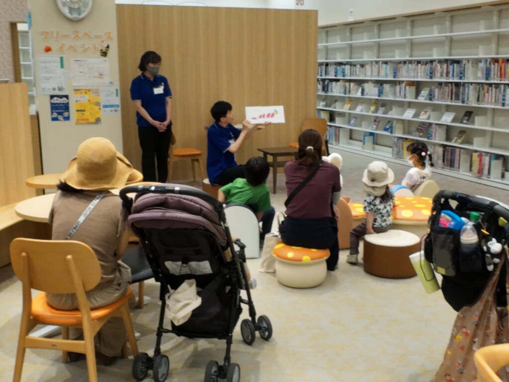絵本を中心に蔵書をしており、毎月第1、3日曜日に季節行事に合わせた工作づくりやおりがみ、絵本の読み聞かせなどを実施しています。また、第2金曜日には「えほんのじかん」を開催し、絵本の世界を語ったり、表現したりと本と人をつなぐ活動をしています。