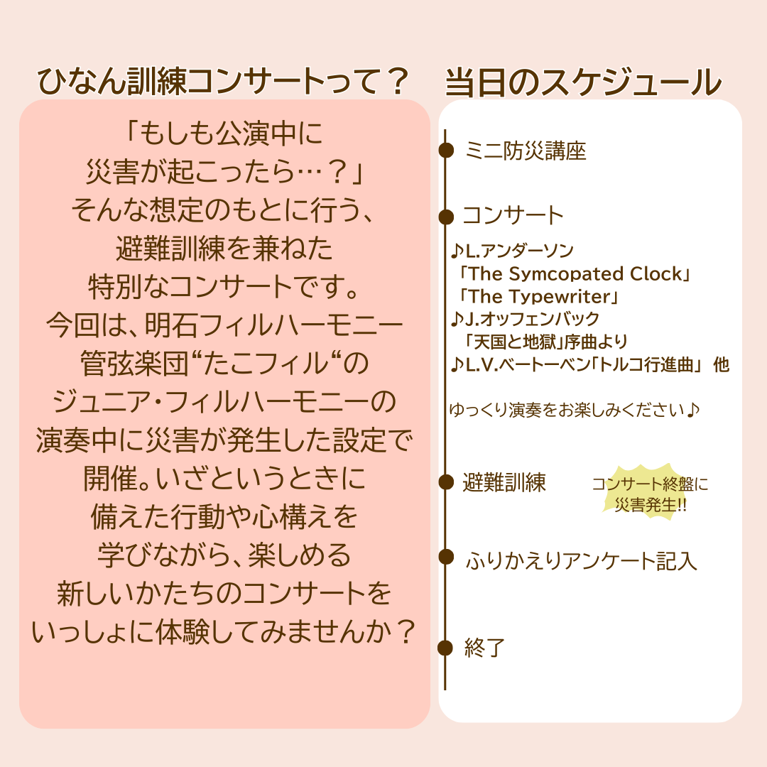 今回は、明石フィルハーモニー管弦楽団“たこフィル“のジュニア・フィルハーモニーの演奏中に災害が発生した設定で開催!いざというときに備えた行動や心構えを学びながら楽しめる新しいかたちのコンサートをいっしょに体験してみませんか?