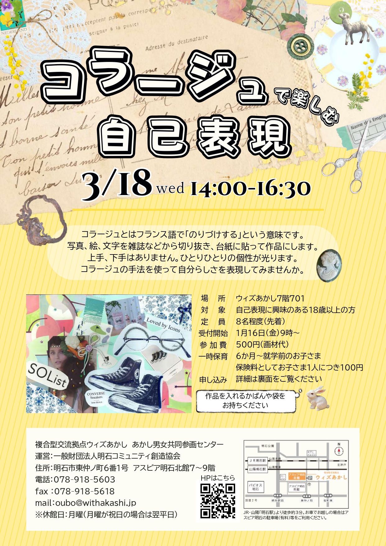 - ・窓口・Googleフォーム・電話:078-918-5603 ・FAX:078-918-5618 ・メール:oubo@withakashi.jp 件名を「コラージュで自己表現」とし氏名(ふりがな)・年代・住所(明石市内か明石市外)・電話番号・一時保育の希望の有無(お子さまのお名前・年齢)を本文に入力しウィズあかしまで