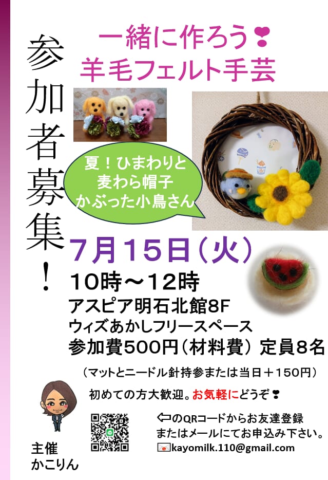- 羊毛マットとニードル針をお持ちの方はご持参ください。<br /> 申込時にお伝えいただければ、+150円でご用意します。