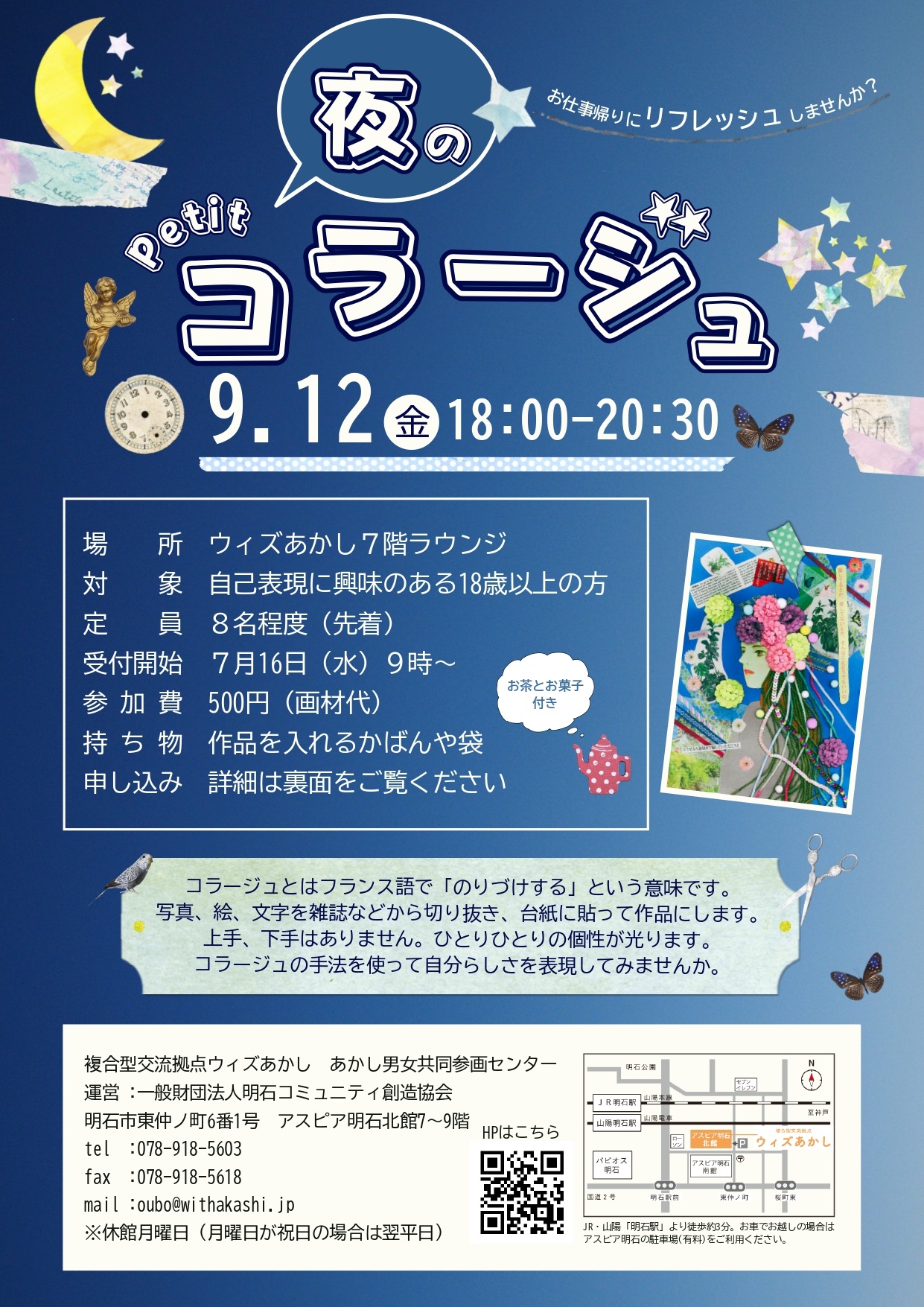 窓口・Googleフォーム:https://forms.gle/Xwr6ZKxjsSiqJqtw6・電話:078-918-5603 ・FAX:078-918-5618 ・メール:oubo@withakashi.jp 件名を「コラージュで自己表現」とし氏名(ふりがな)・年代・住所(明石市内か明石市外)・電話番号を本文に入力しウィズあかしまで