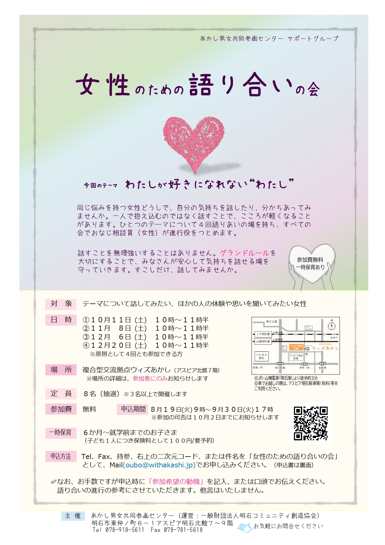 - 申し込み期間:8月19日(火)9時~9月30日(火)17時<br /> ※参加の可否は10月2日までにお知らせします。<br /> <br /> 一時保育:6か月~就学前の幼児/定員あり<br /> 保険料としてお子さま1人につき100円<br /> <br /> お手数ですが申込時に「参加希望の動機」を記入、または口頭でお伝えください。語り合いの進行の参考にさせていただきます。他言はいたしません。