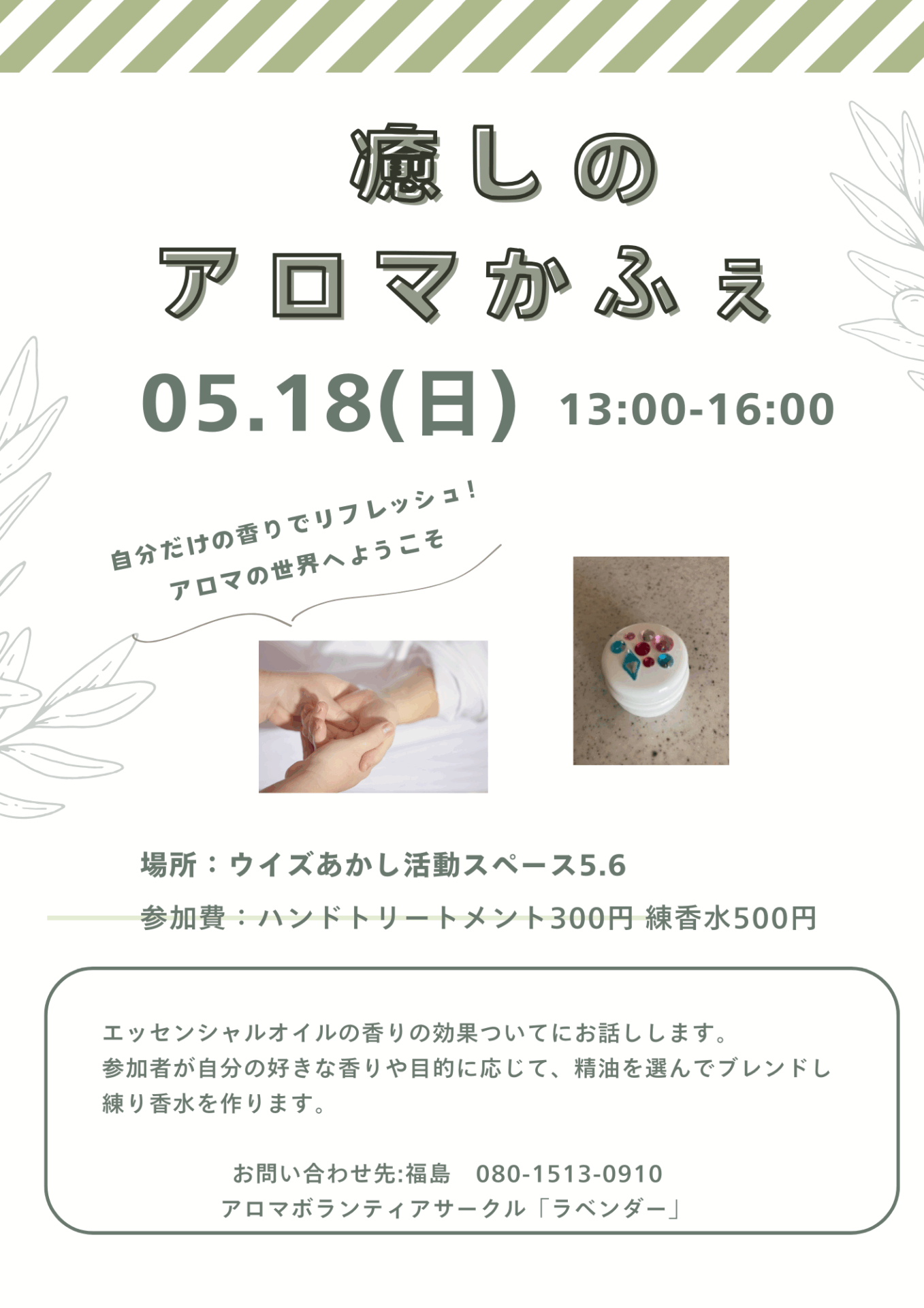 - アロマハンドケア(材料費):300円 練香水:500円スプレー作り(材料費):500円