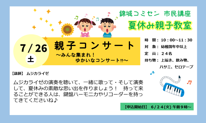 - わたしたち「ムジカライゼ」は童謡からクラシックまで幅広いレパートリーで、「皆さまに音楽をより身近に感じていただきたい!」と活動しているグループです。わたしたちの演奏を聴いて、歌って、そして演奏しましょう!参加したみなさんで一緒に楽しみ、夏休みの素敵な思い出を作りましょう!