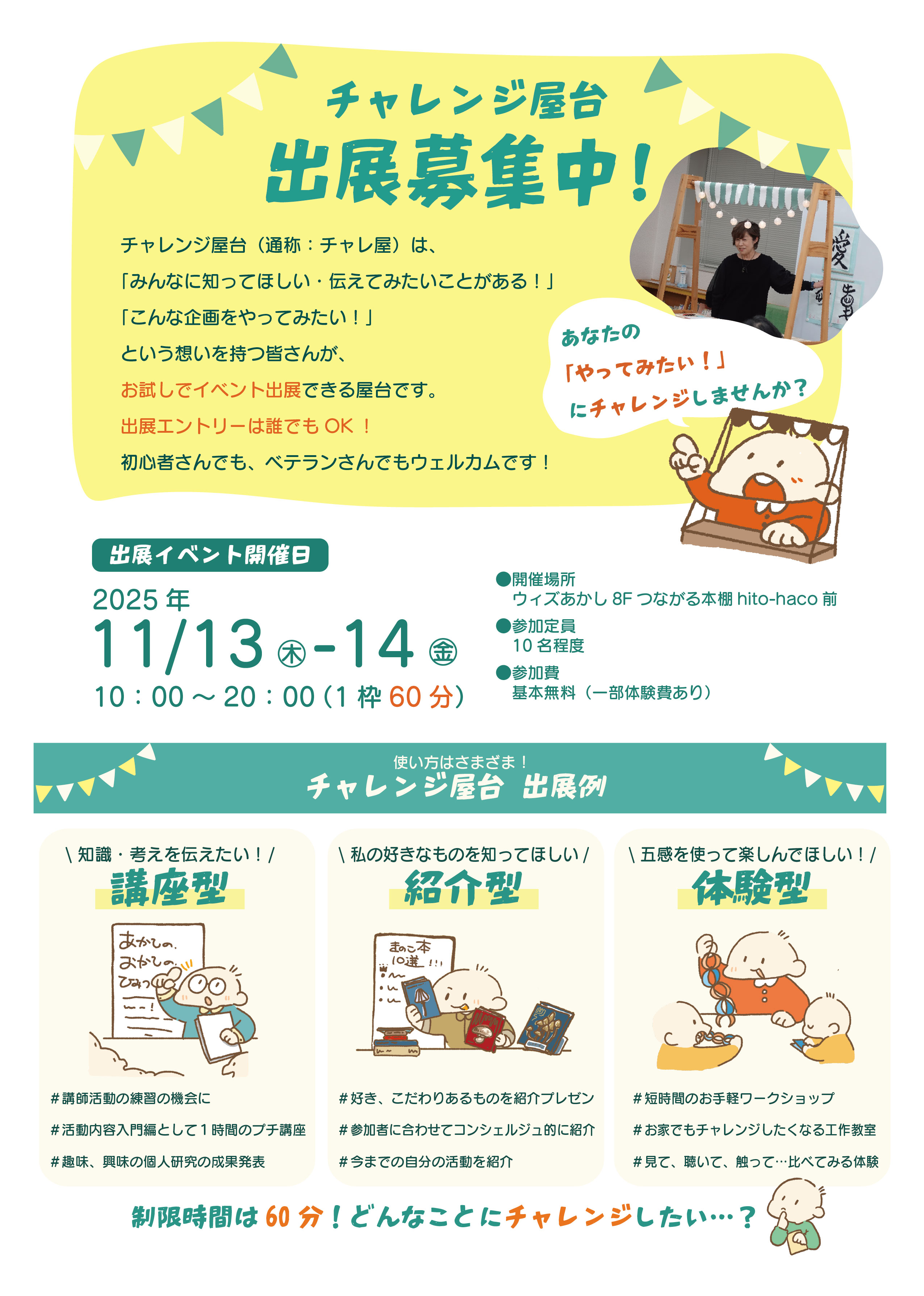 チャレンジ屋台は、「みんなに知って欲しい伝えてみたいことがある!」「こんな企画やってみたい!」という想いを持った人たちが、自分なりのチャレンジを形にした屋台イベントです。