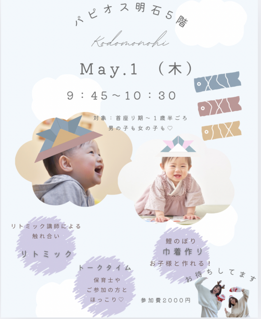 - 1部:ファーストアートでこいのぼりくん巾着を作ろう♪親子リトミック♪親子あそびを楽しもう♪育児相談会開催中♡