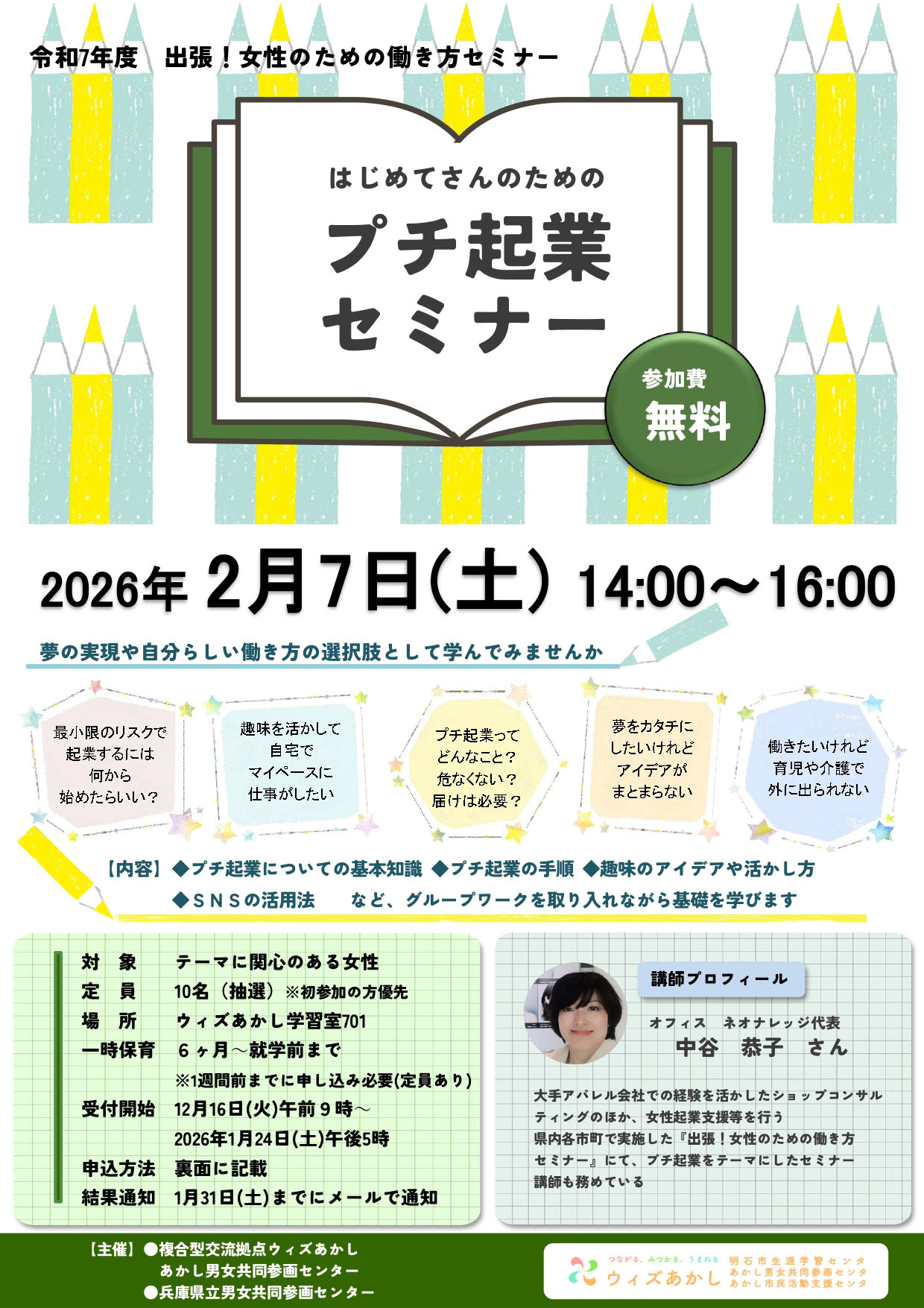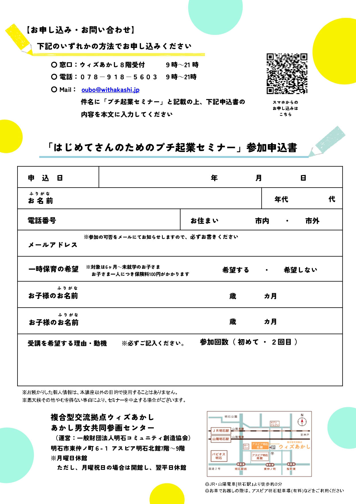 - 《申込受付開始》12/16(火)9時~ Googleフォーム:https://forms.gle/9HWxFTNtwLwgJMQTA 電話:078-918-5603(9時~21時) MAIL:oubo@withakashi.jp(件名を「働き方セミナー」とし、氏名・ふりがな・年代・お住まい(明石市内・明石市外)・電話番号・志望動機・一時保育の希望の有無(お子さまのお名前・年齢)