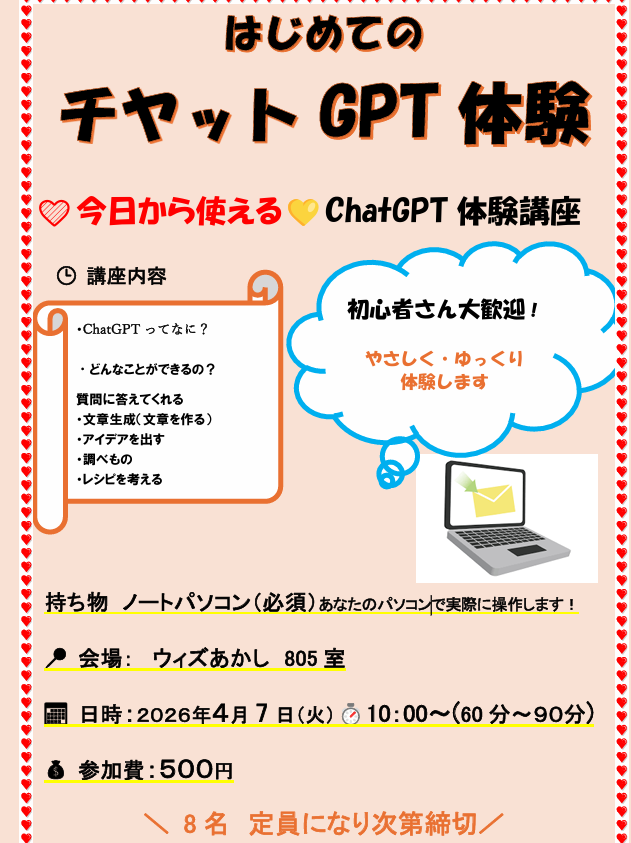 ・ノートパソコンをご持参ください。・可能であれば事前にChatGPTのアカウントを作成しておくとスムーズです。・定員になり次第、受付を終了します。