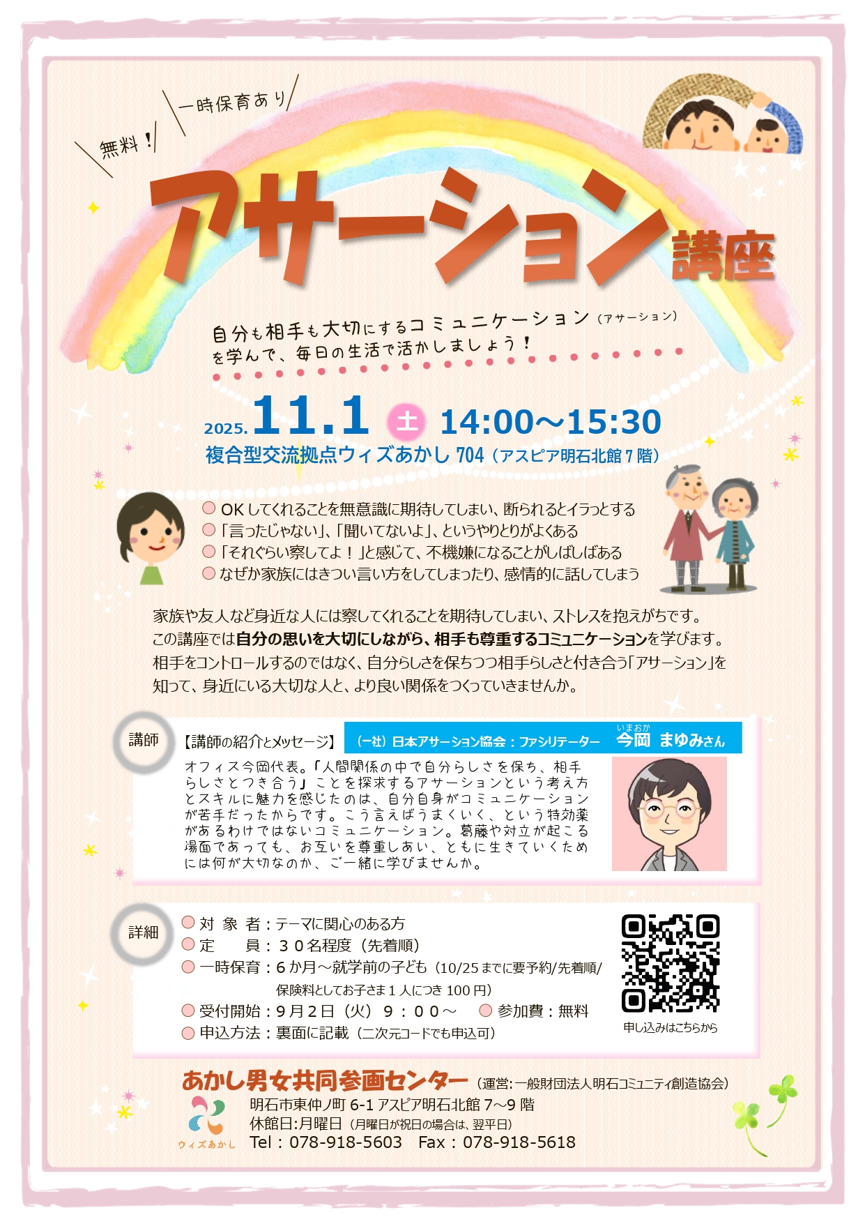 講座参加者のうち、希望される方を対象に「アサーション練習会」を実施予定です。※講座とは別日。詳細は講座当日にご案内します。 - 画像
