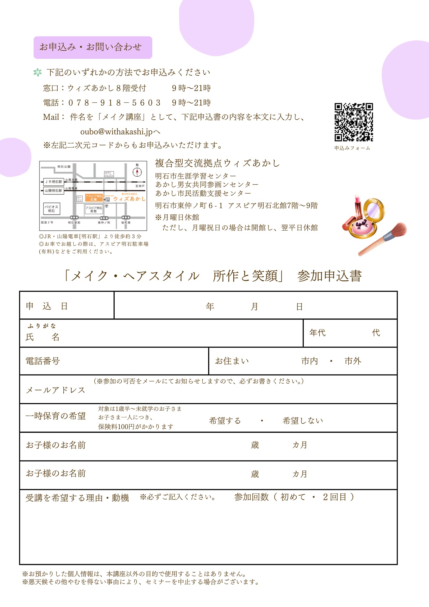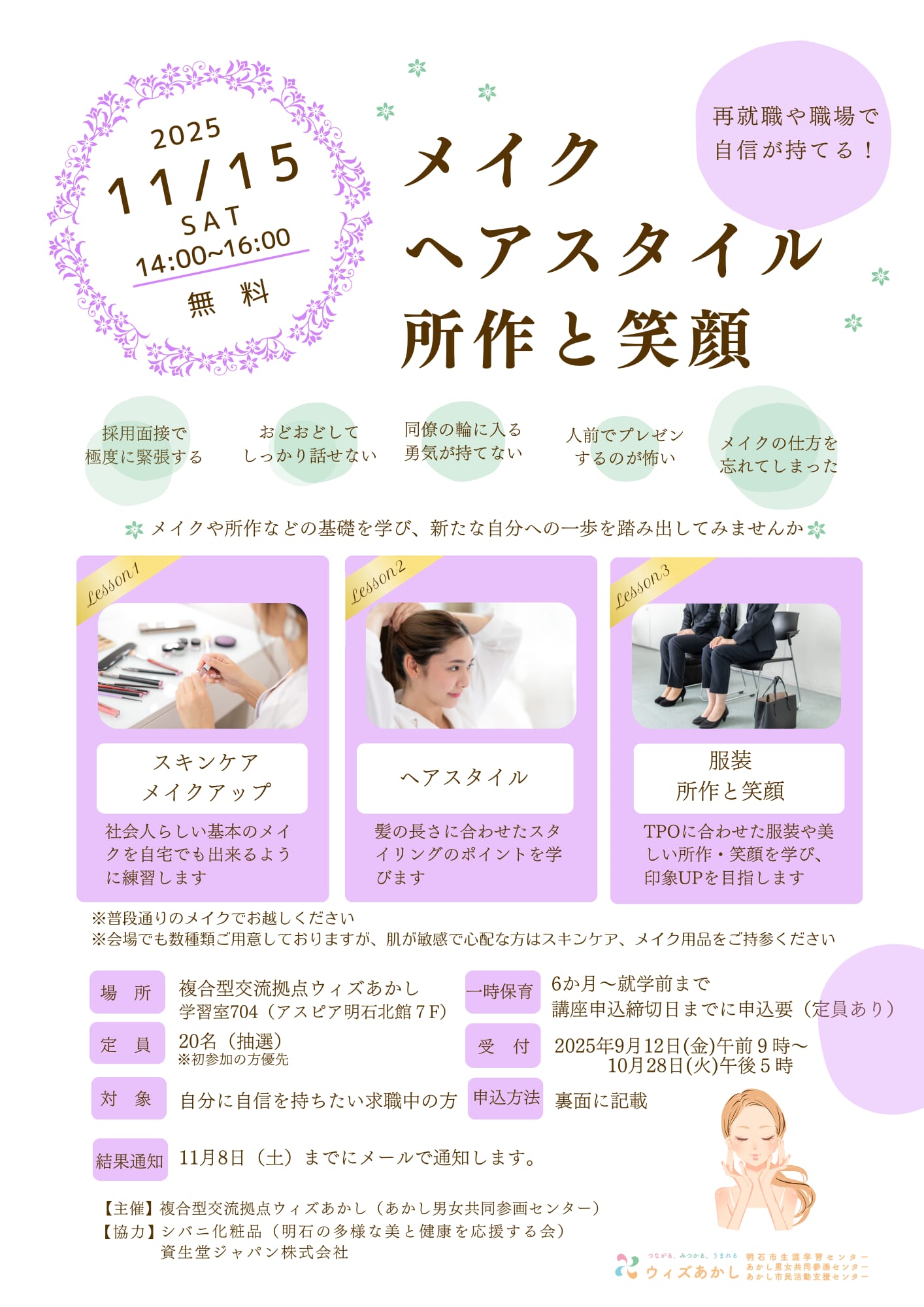 【主催】複合型交流拠点ウィズあかし(あかし男女共同参画センター)【協力】シバニ化粧品(明石の多様な美と健康を応援する会)資生堂ジャパン株式会社