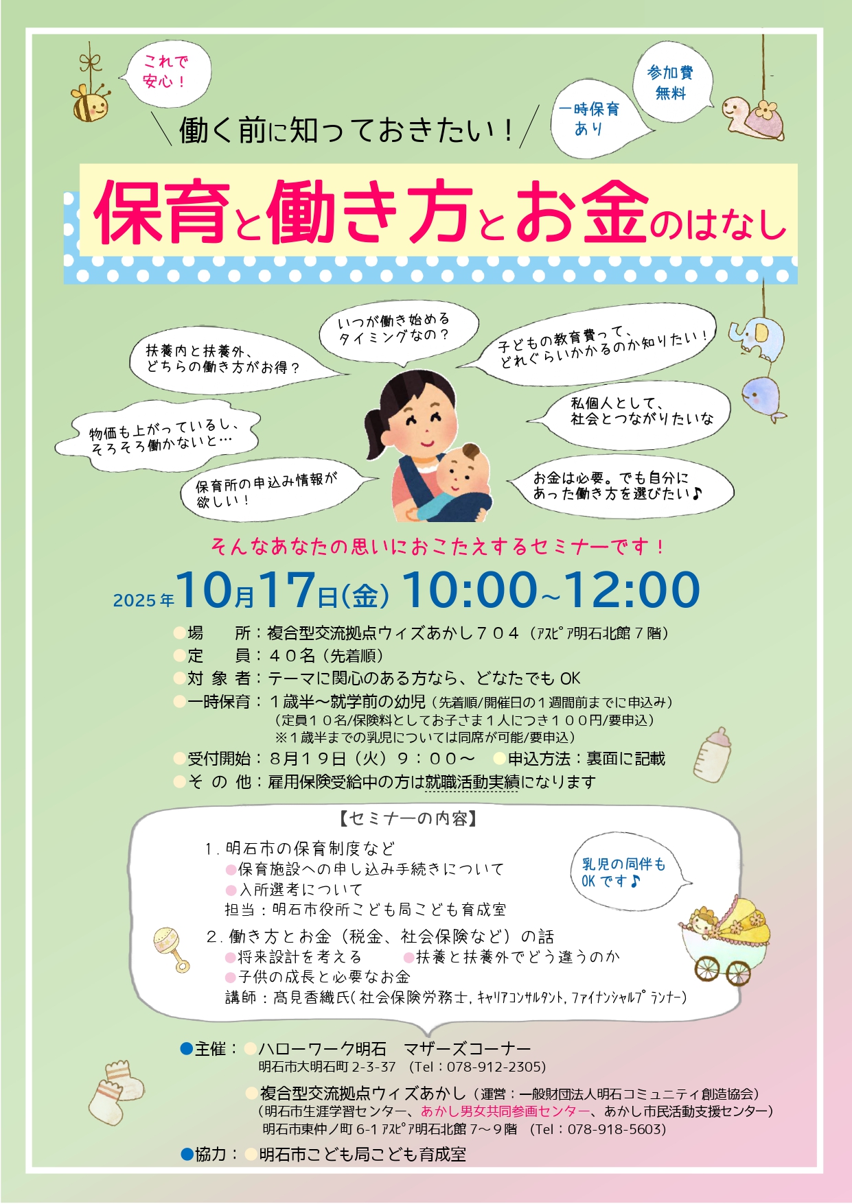 - 【ハローワーク明石マザーズコーナー】 ・電話:078-912-2305 ・窓口:受付時間9時~17時(土日祝日は閉庁)【複合型交流拠点ウィズあかし】電話:078-918-5603 FAX:078-918-5618 MAIL:oubo@withakashi.jp 件名を「保育、働き方、お金のはなし」として、お名前(ふりがな)、年代、電話番号、メールアドレス、一時保育の希望の有無(お子さまのお名前、年齢)を記入の上、ウィズあかしまでお申し込みください。
