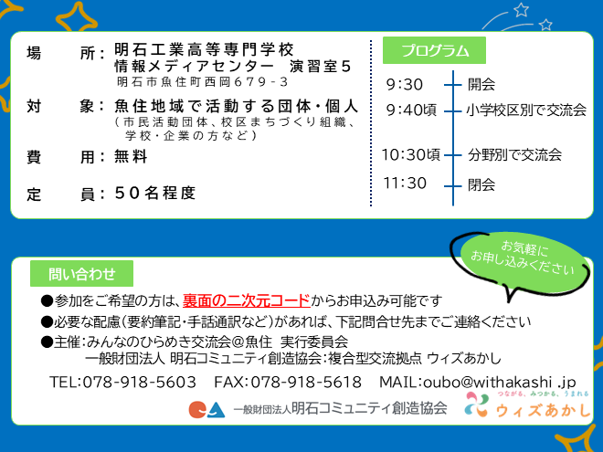 - 主催:一般財団法人 明石コミュニティ創造協会 / 複合型交流拠点 ウィズあかし TEL:078-918-5603 MAIL:oubo@withakashi.jp