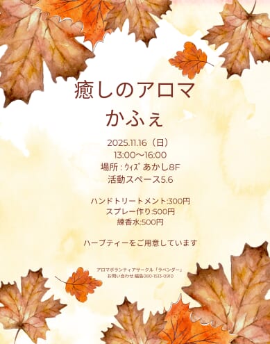 - 季節の変わり目で体調が崩れやすい時です。アロマで少し癒されては如何でしょうか。