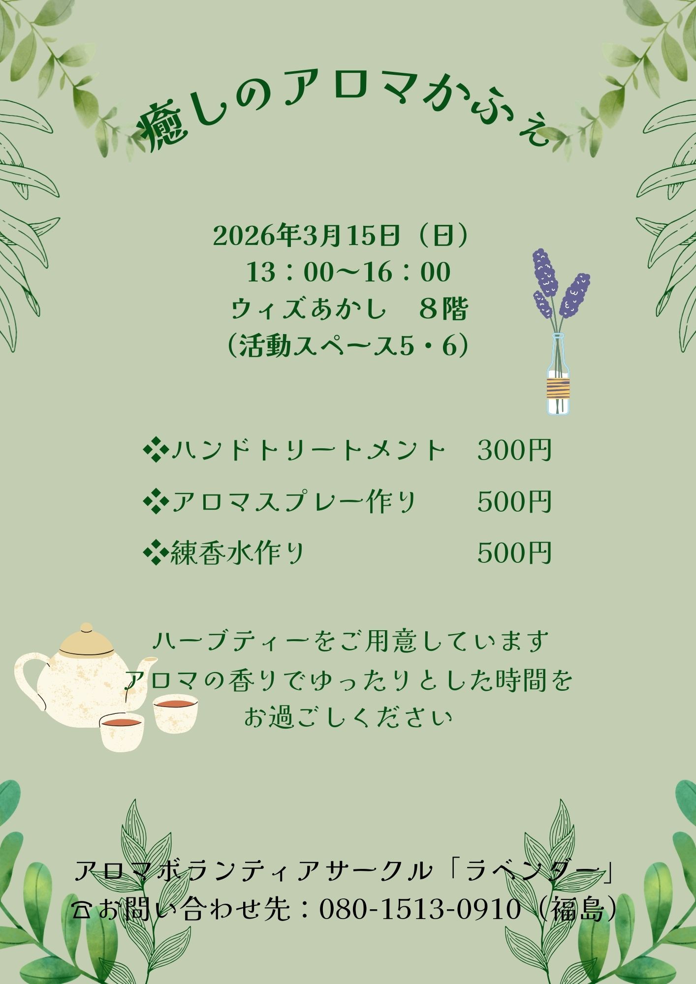 - アロマハンドトリートメント(材料費):300円 アロマスプレー作り(材料費):500円 練香水作り(材料費):500円
