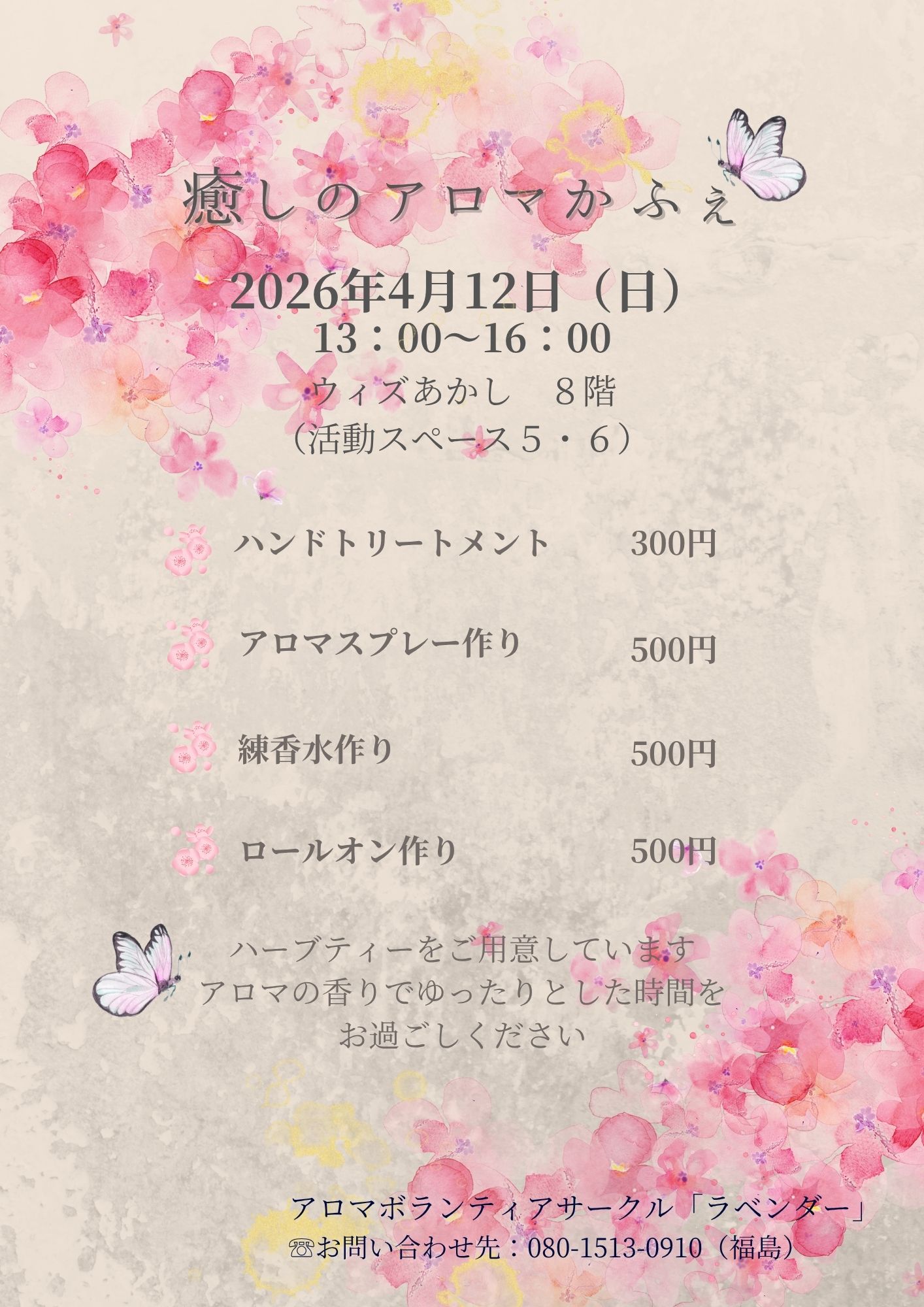 - アロマハンドケア(材料費):300円 アロマスプレー作り(材料費):500円 練香水作り(材料費):500円 ロールオン作り(材料費):500円