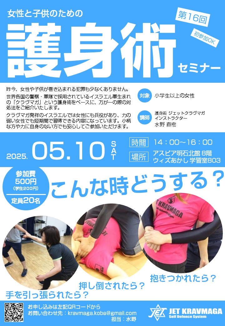 昨今、女性が巻き込まれる犯罪も少なくありませんので、普段なかなか護身術を学ぶ機会のない方に一歩だけ踏み出していただければ幸いです。