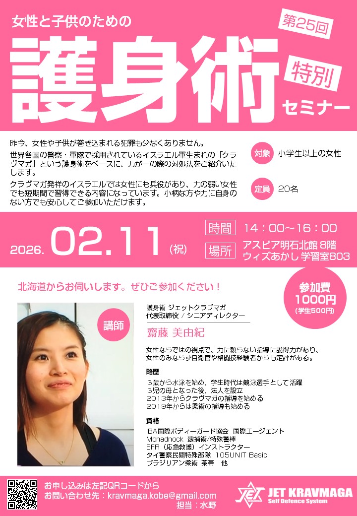 - 2023年より月1回のペースで開催してまいりましたウィズあかしでの護身術セミナーですが、記念すべき第25回に初めて当団体の代表取締役でもある女性トップインストラクターを本部のある北海道から招いてセミナーを開催いたします。