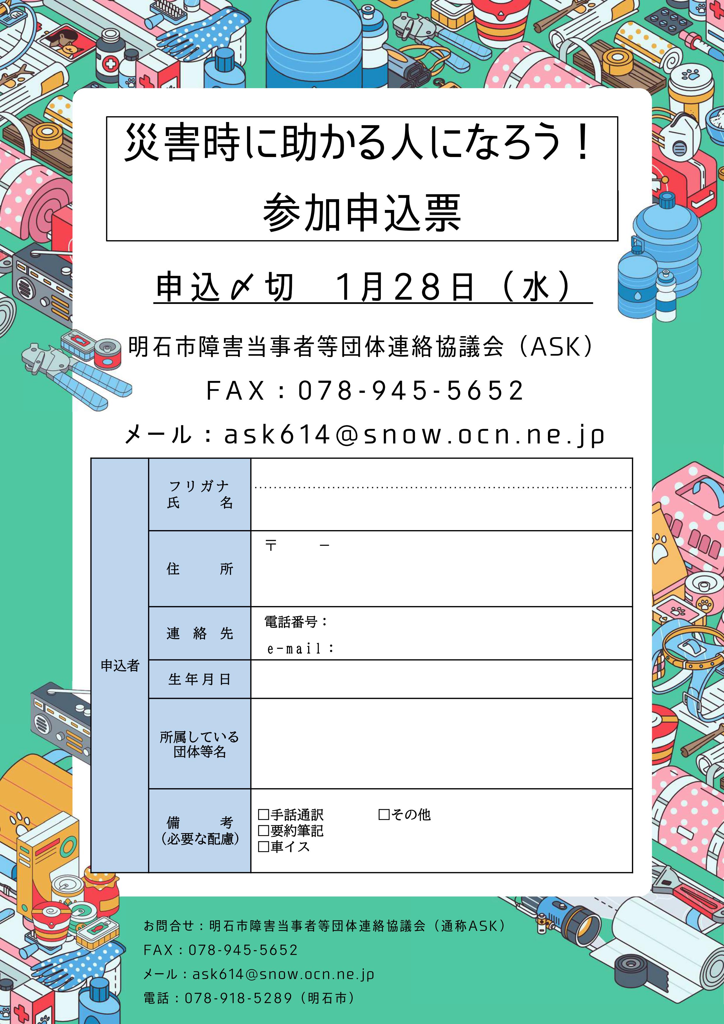 - 南海トラフ地震などの災害に備えて、障害がある人もない人も、災害時にみんなで助かることができるよう、事前にどのようなことが準備になるのか等を考える機会として、明石市障害当事者等団体連絡協議会(通称ASK(あすく))と市の共催で、防災講演会を開催します。