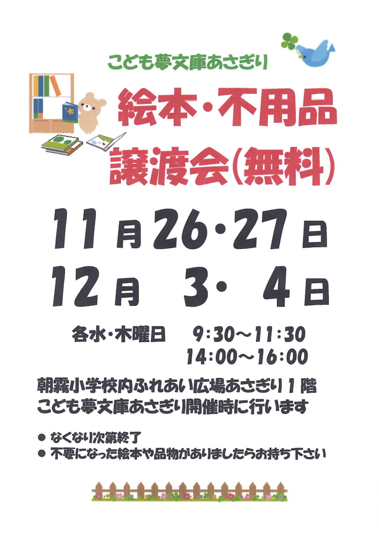「絵本・不用品の譲渡会(無料)」の開催案内 投稿日 2025年11月5日 著者 asagiri カテゴリー 朝霧 主催:こども夢文庫あさぎり日時:11月26・27日、12月3・4日 各水・木曜日 9:30~11:30、14:00~16:00場所:朝霧小学校内、ふれあい広場あさぎり1階 EPSON MFP image
