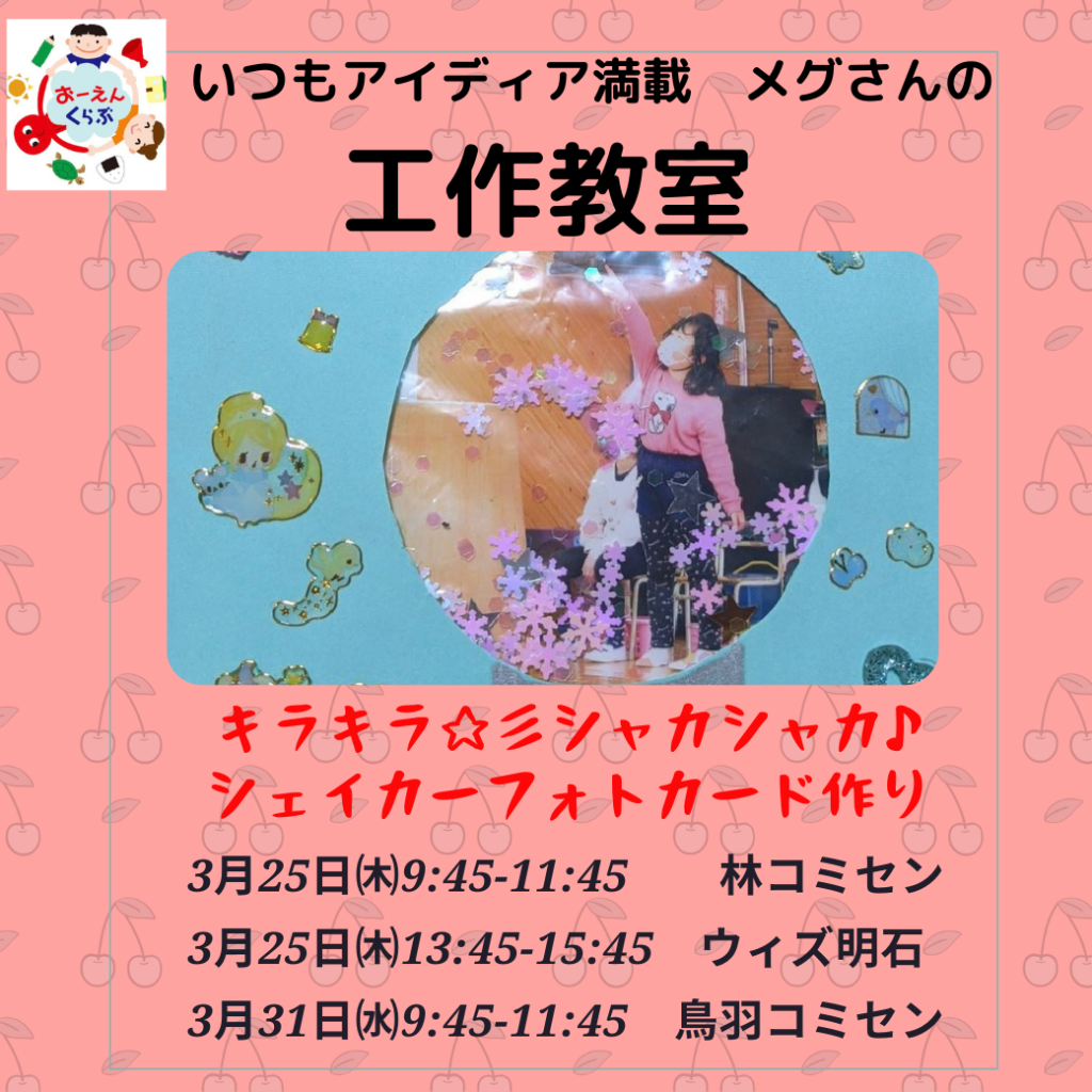 【林コミセン】 3月25日(木曜日)9:45-11:45 【ウィズあかし】 3月25日(木曜日) 13:45-15:45 【鳥羽コミセン】 3月31日(水曜日)9:45-11:45