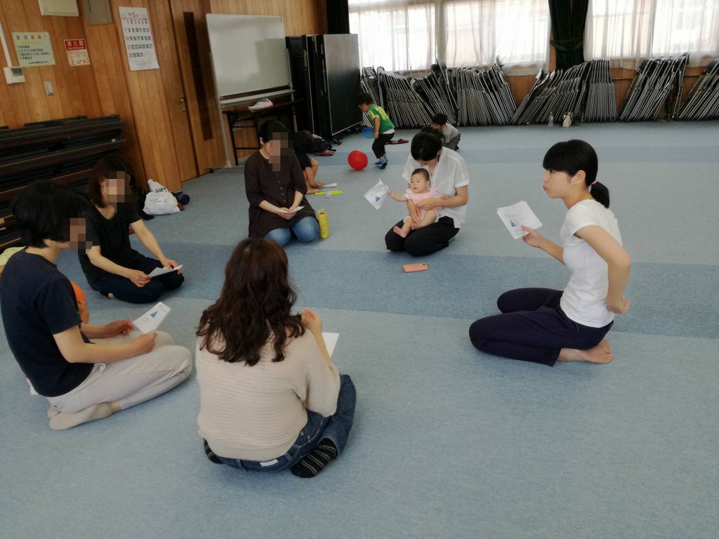 おやこでスキンシップの体操やお子さん向けの手遊び、お母さんを中心にした体操を織り交ぜながら楽しく体を動かします。体操の後は、心理カウンセラーの増田先生のお話と子育て相談受けてくださいます。
