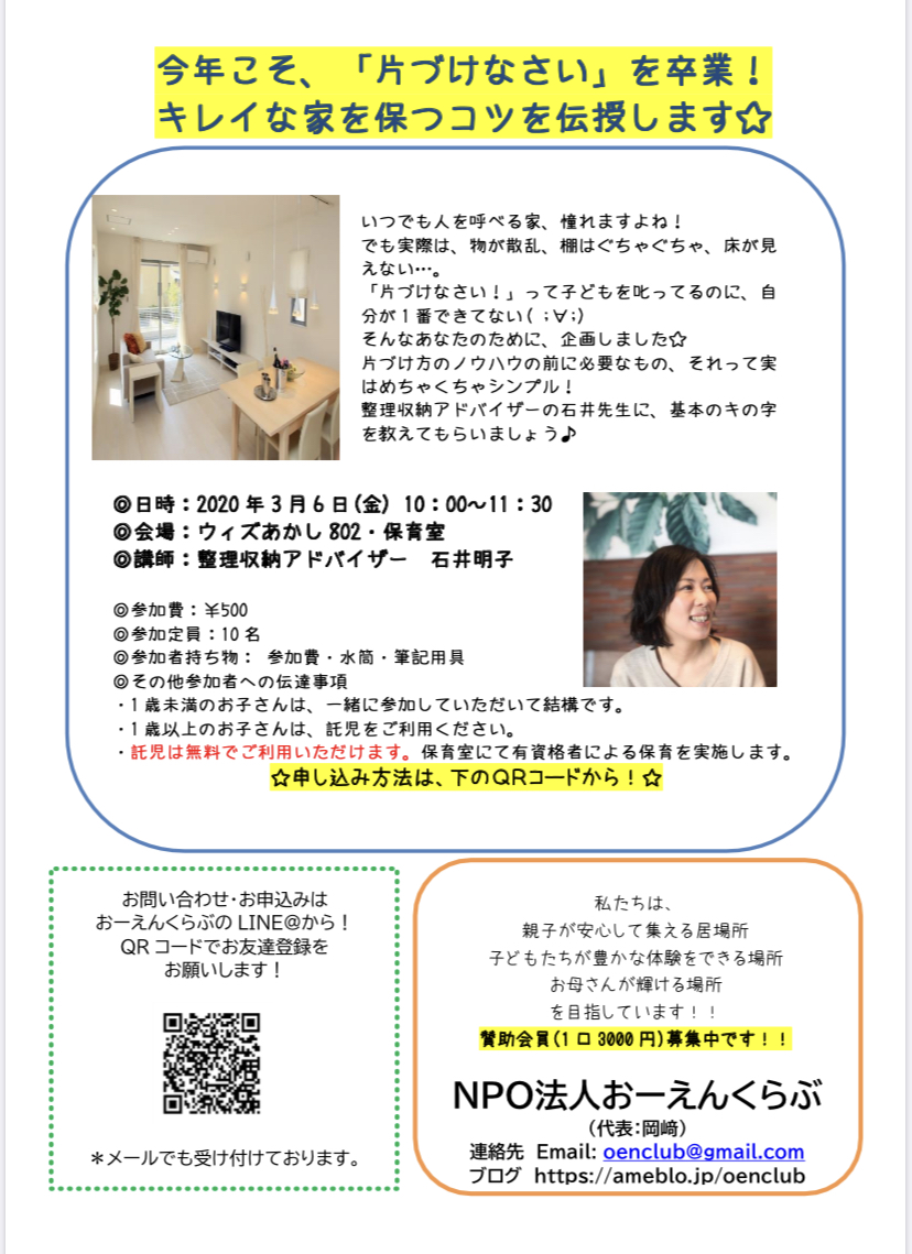 開催日:2020年3月6日(金曜日) 【中止になりました】今年こそ「片づけなさい」を卒業!